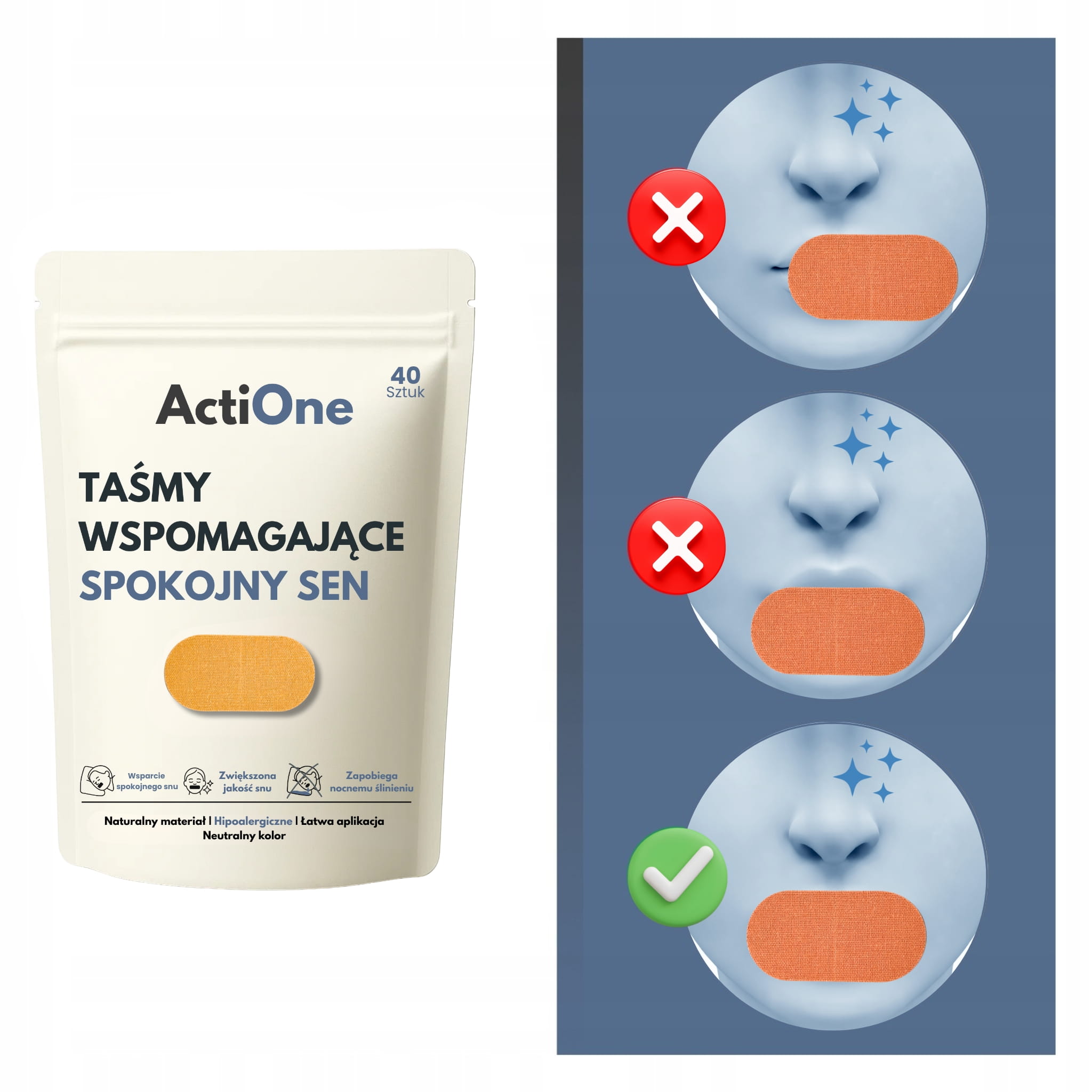 Specjalny klej hipoalergiczny gwarantuje, że taśma utrzyma się przez całą noc — bez uczucia ciągnięcia czy dyskomfortu.
